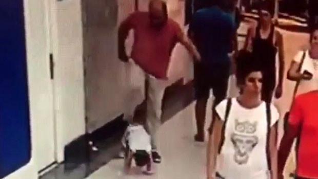 Olayı gören çevredekiler, adamı davranışı nedeniyle uyarıp durumu güvenlik personeline bildirdi. Çevredekilerle de tartışmaya giren adam kucağında taşıdığı bebeği ve diğer 3 çocuğuyla merkezinden ayrıldı. Olay, yakındaki iş yerinin güvenlik kamerasınca saniye saniye kaydedildi.