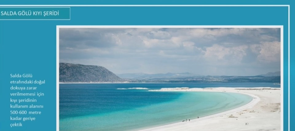 Araçların kıyıya kadar girdiği çöplerin dağ oluşturduğunun tespitini yaptık. Bunun neticesinde araçlar kıyıya kadar gelip burada hem doğal güzelliklere zarar veriyorlardı gelenlerin doğal güzellikleri görmesine mani oluyorlardı. Araçların buraya girmesini engelleyecek doğal ahşap bariyeler de koyduk. Bu alana araçlar giremiyor. Özel çevre koruma bölgesinde hiçbir yapılaşma olmayacak. Kaçak yapıları yıktık, hiçbir yapılaşmaya izin vermeyeceğiz. Günlük konaklamaya müsaade edilmeyecek. Salda hepimizin Salda hep güzel kalacak. 295 kilometrekarelik alan özel çevre koruma bölgesi.''