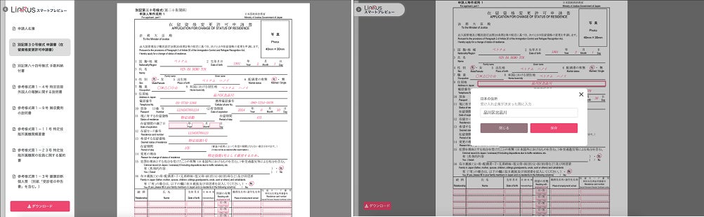 登録支援機関や受け入れ企業が行う、特定技能・技能実習の雇用書類や計画書の作成場面で、最も情報の抜け漏れや誤り等に気づくのが印刷前のプレビュー画面での確認です。これまでは、プレビュー表示で誤りや不足情報に気づいた場合には、その情報の登録画面に移動し、登録情報を修正する必要がありました。今回の「スマプレ」機能では、最終のプレビュー画面を直接編集することができます。誤りに気付いた場合にも作業を中断することなく情報を修正し、そのまま書類印刷を続けることができます。さらに、ダウンロードする書類とLinkus内の登録情報に齟齬が生じないように、スマプレ画面から編集された情報は自動的にLinkusのデータベースに反映されます。